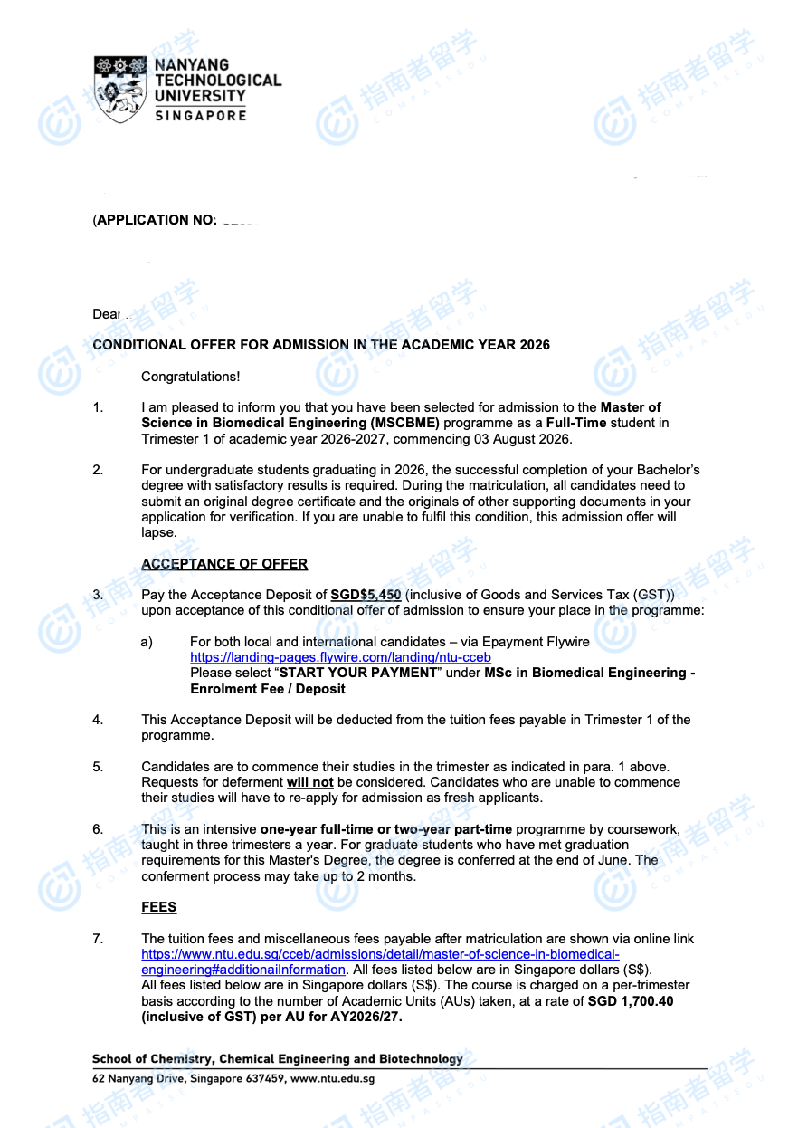 南洋理工大學(xué)生物醫(yī)學(xué)工程理學(xué)碩士研究生offer一枚