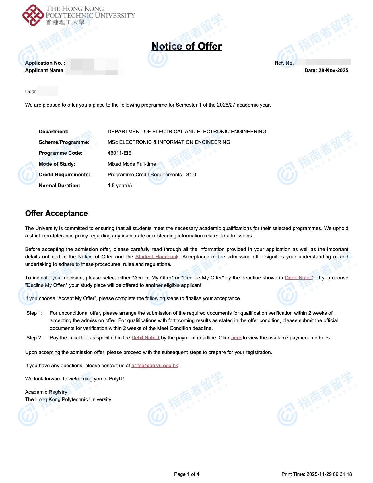香港理工大學(xué)電子及資訊工程學(xué)理學(xué)碩士研究生offer一枚