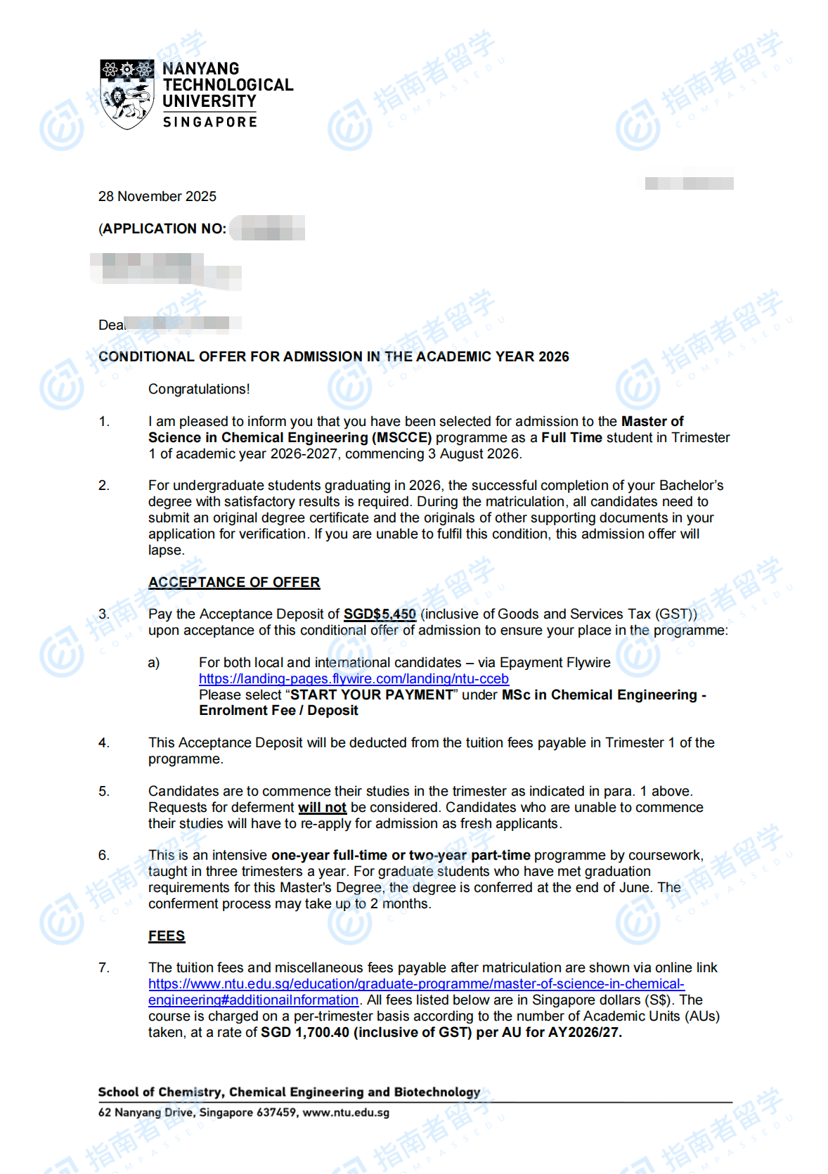 南洋理工大學(xué)化學(xué)工程理學(xué)碩士研究生offer一枚