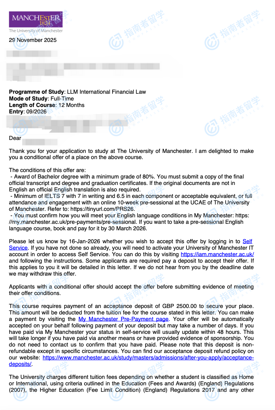 曼徹斯特大學(xué)國際金融法學(xué)碩士研究生offer一枚