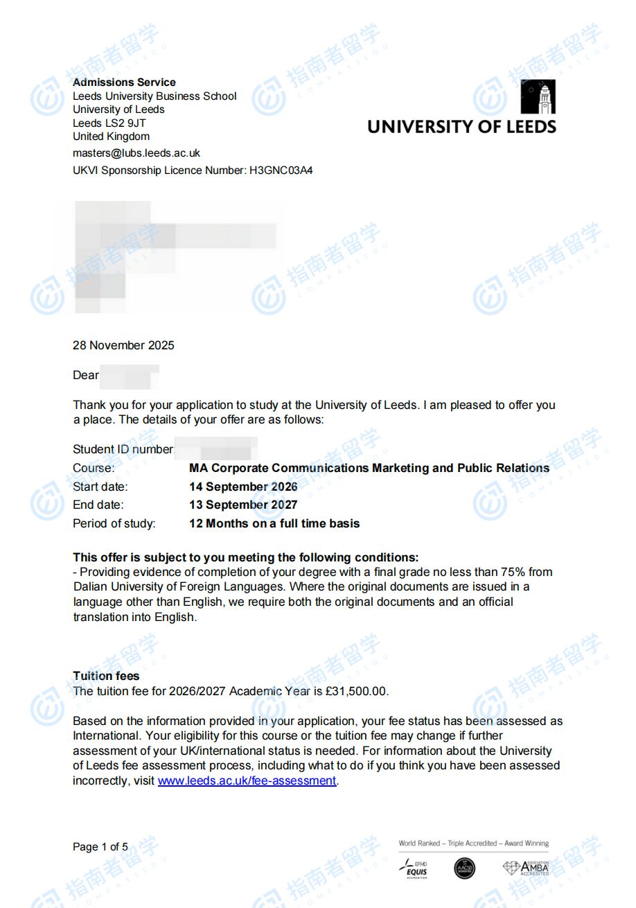 利茲大學(xué)企業(yè)傳播、市場(chǎng)營(yíng)銷與公共關(guān)系文學(xué)碩士研究生offer一枚