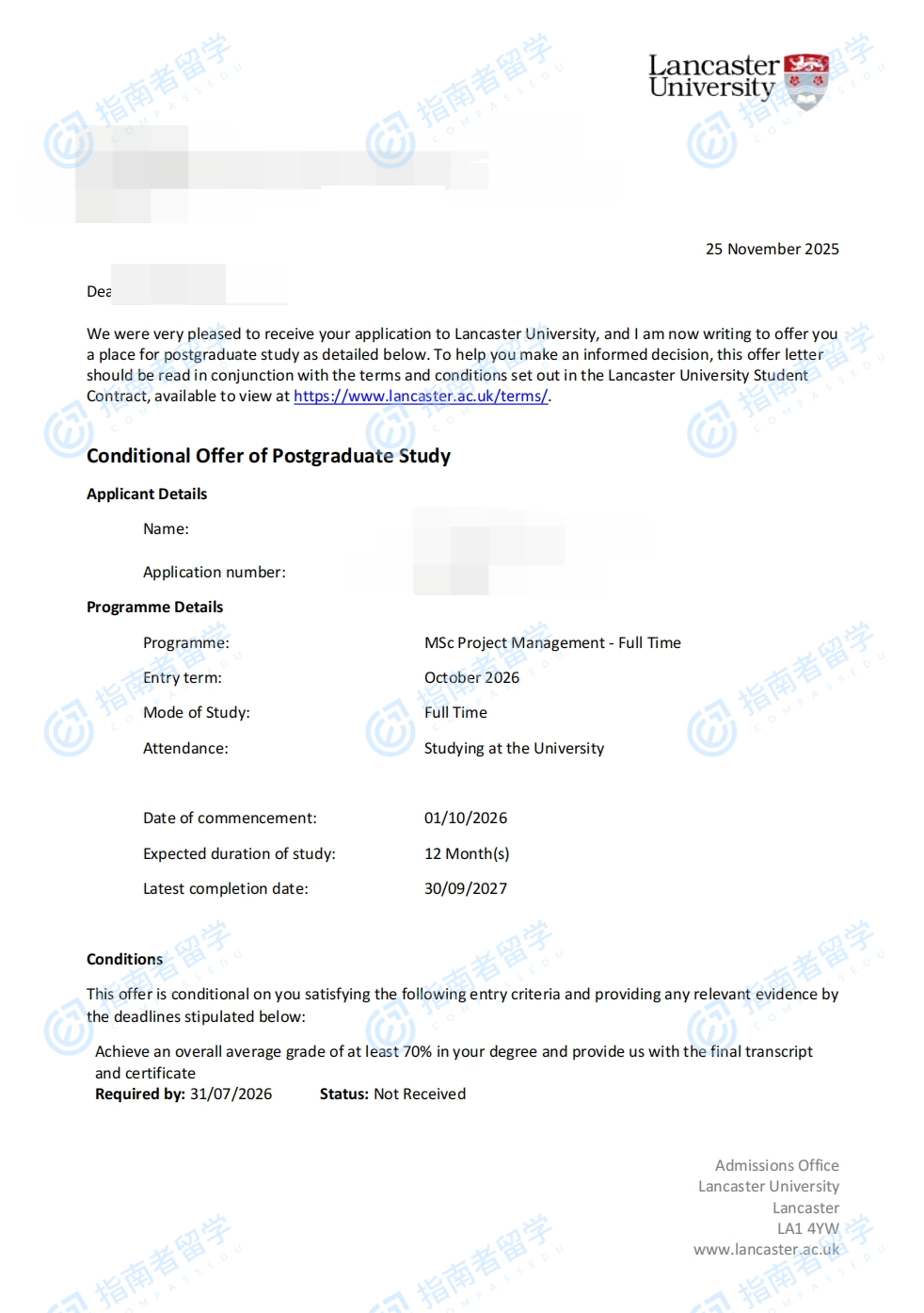 蘭卡斯特大學(xué)項目管理理學(xué)碩士研究生offer一枚