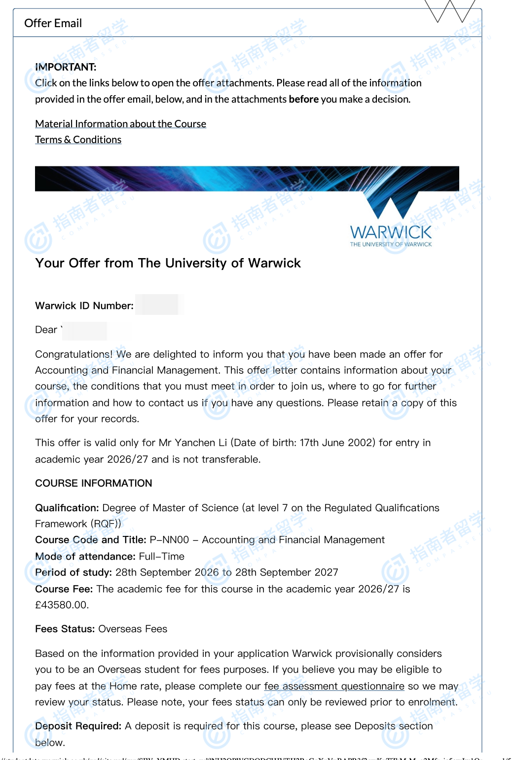 華威大學(xué)會(huì)計(jì)與財(cái)務(wù)管理理學(xué)碩士研究生offer一枚