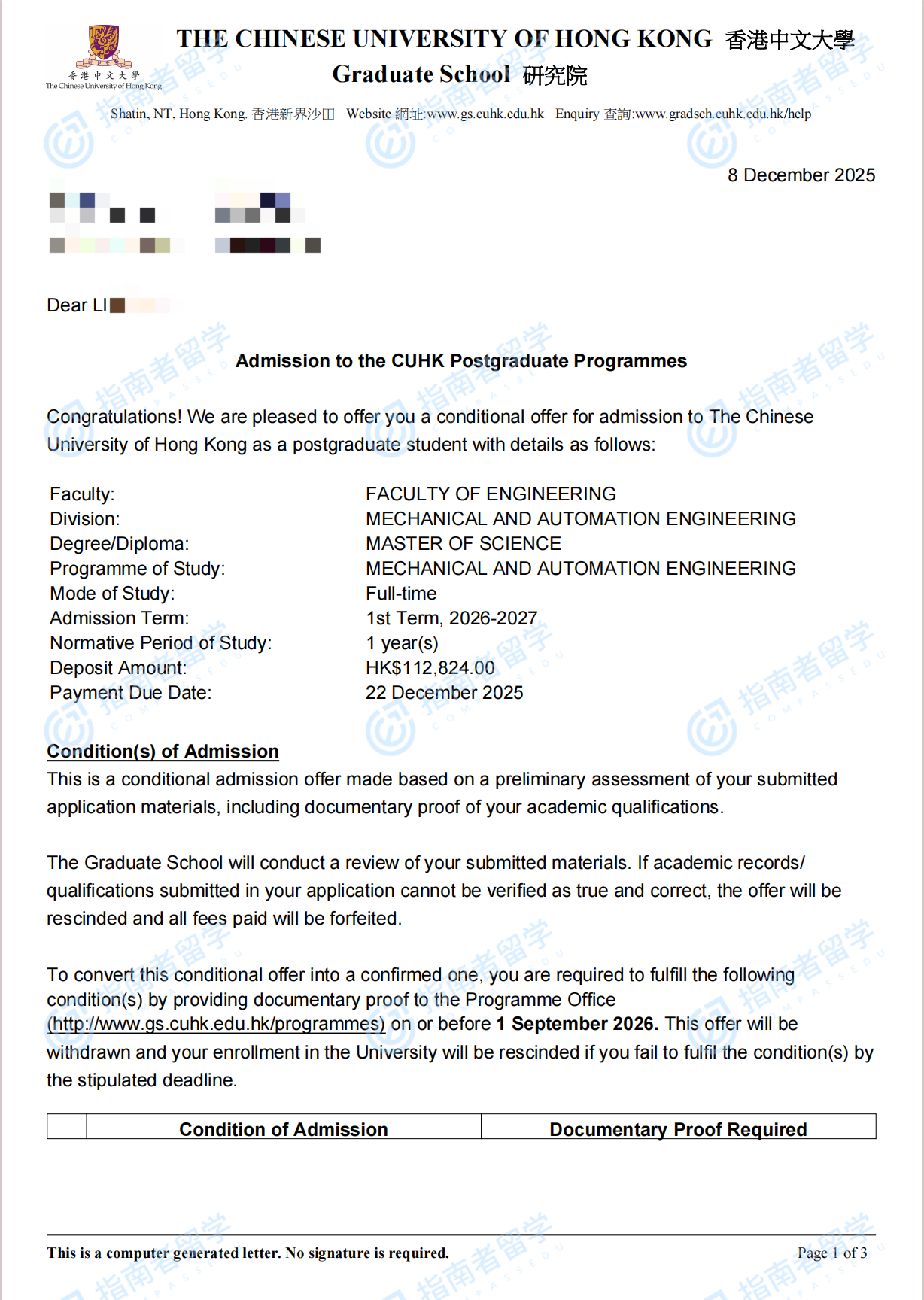 香港中文大學機械與自動化工程理學碩士研究生offer一枚