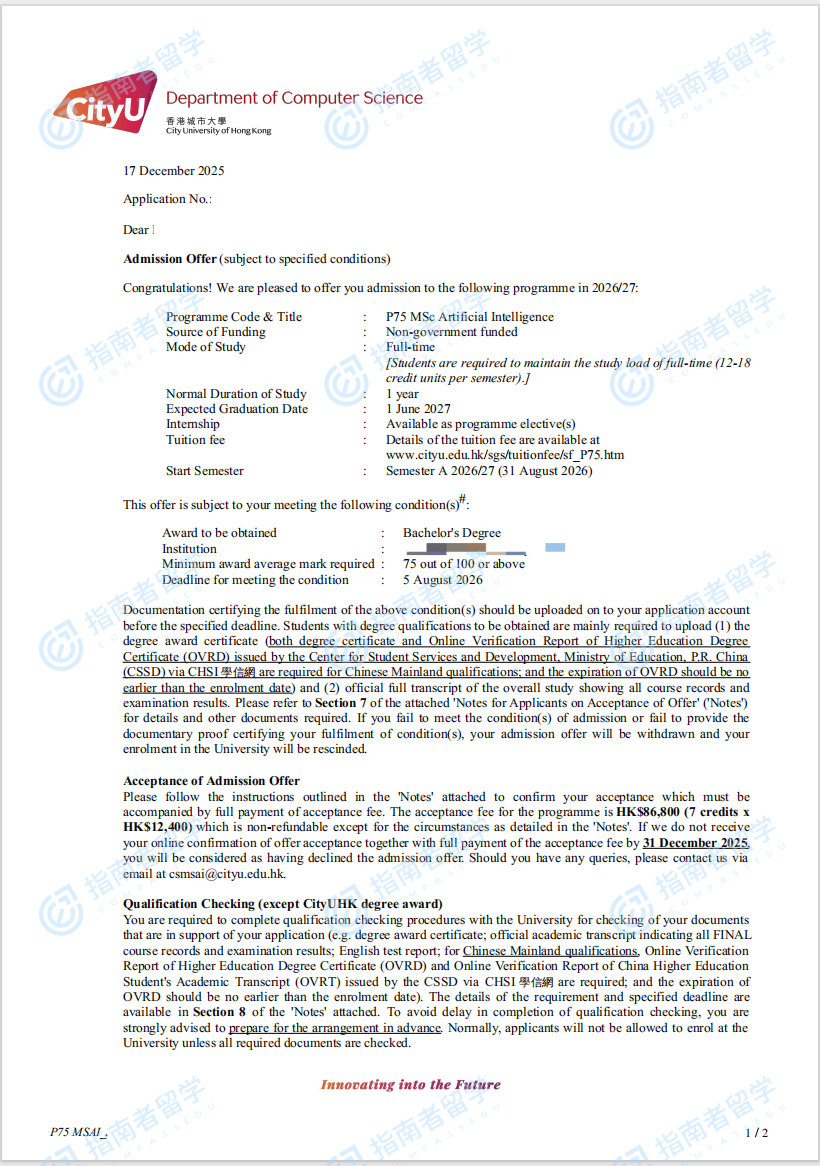 香港城市大學(xué)人工智能理學(xué)碩士研究生offer一枚