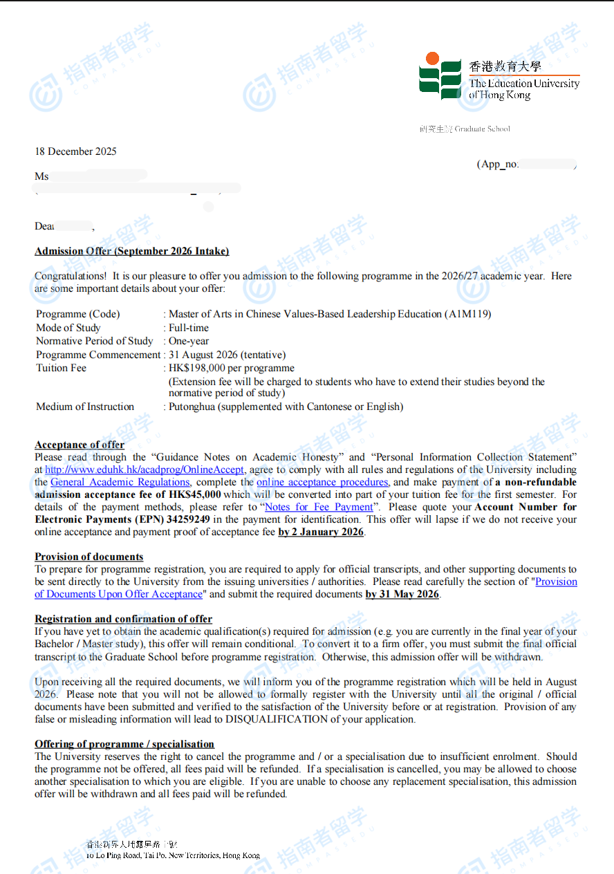 香港教育大學中國價值領(lǐng)導教育文學碩士研究生offer一枚