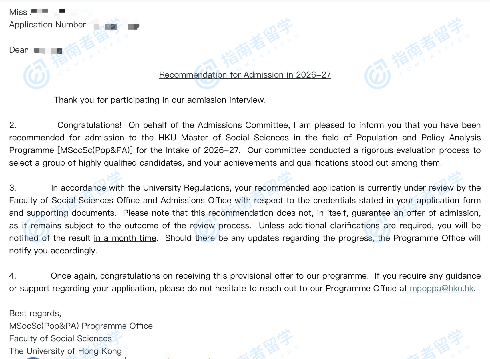 香港大學人口與政策分析社會科學碩士研究生offer一枚