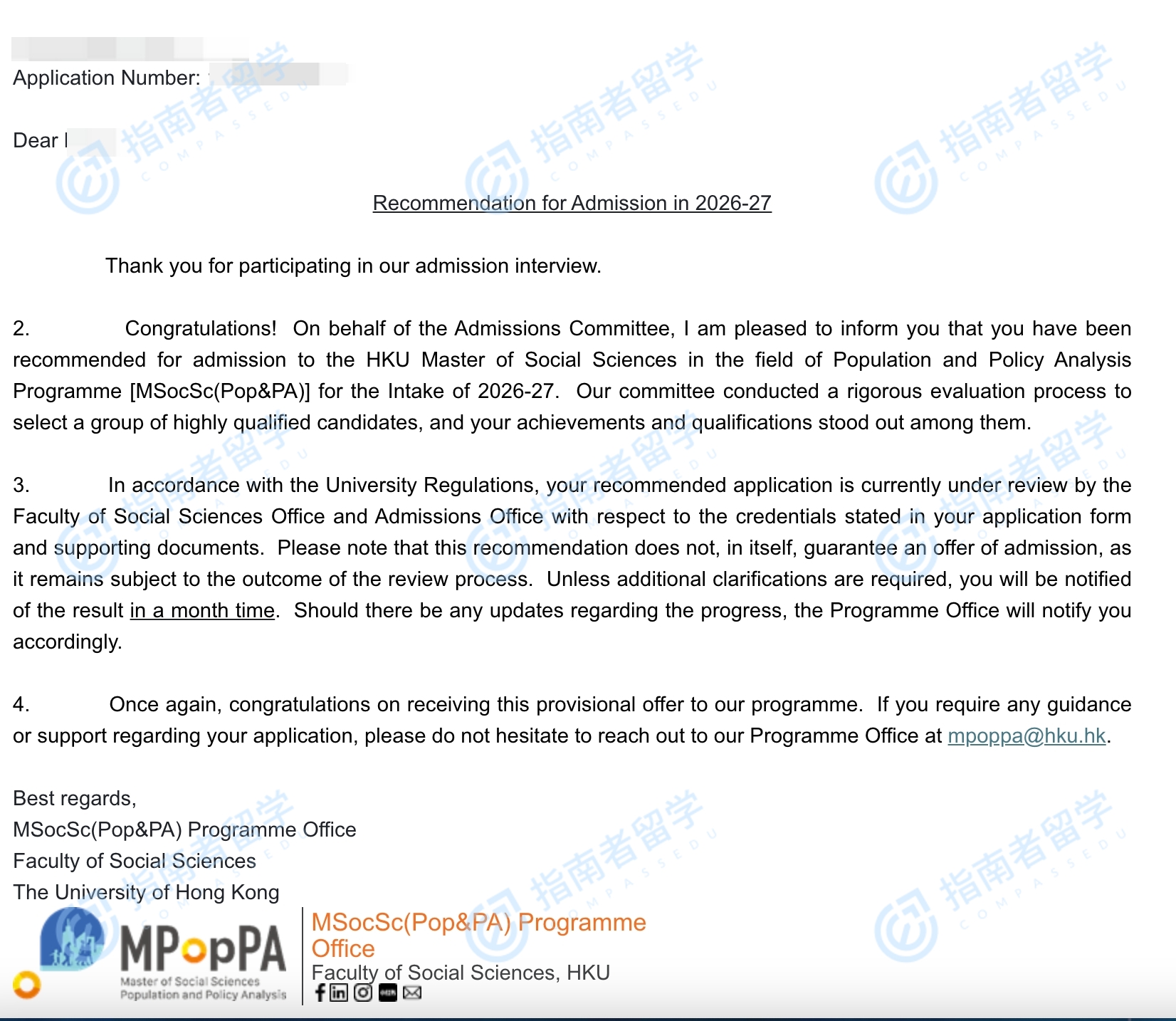 香港大學(xué)人口與政策分析社會(huì)科學(xué)碩士研究生offer一枚