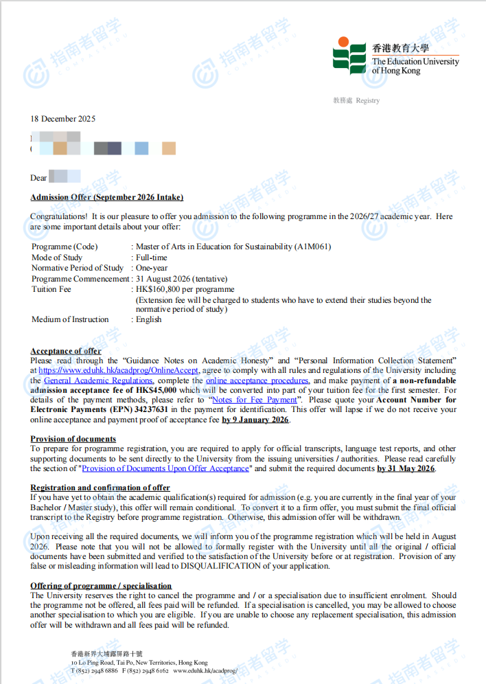 香港教育大學(xué)可持續(xù)發(fā)展教育文學(xué)碩士研究生offer一枚