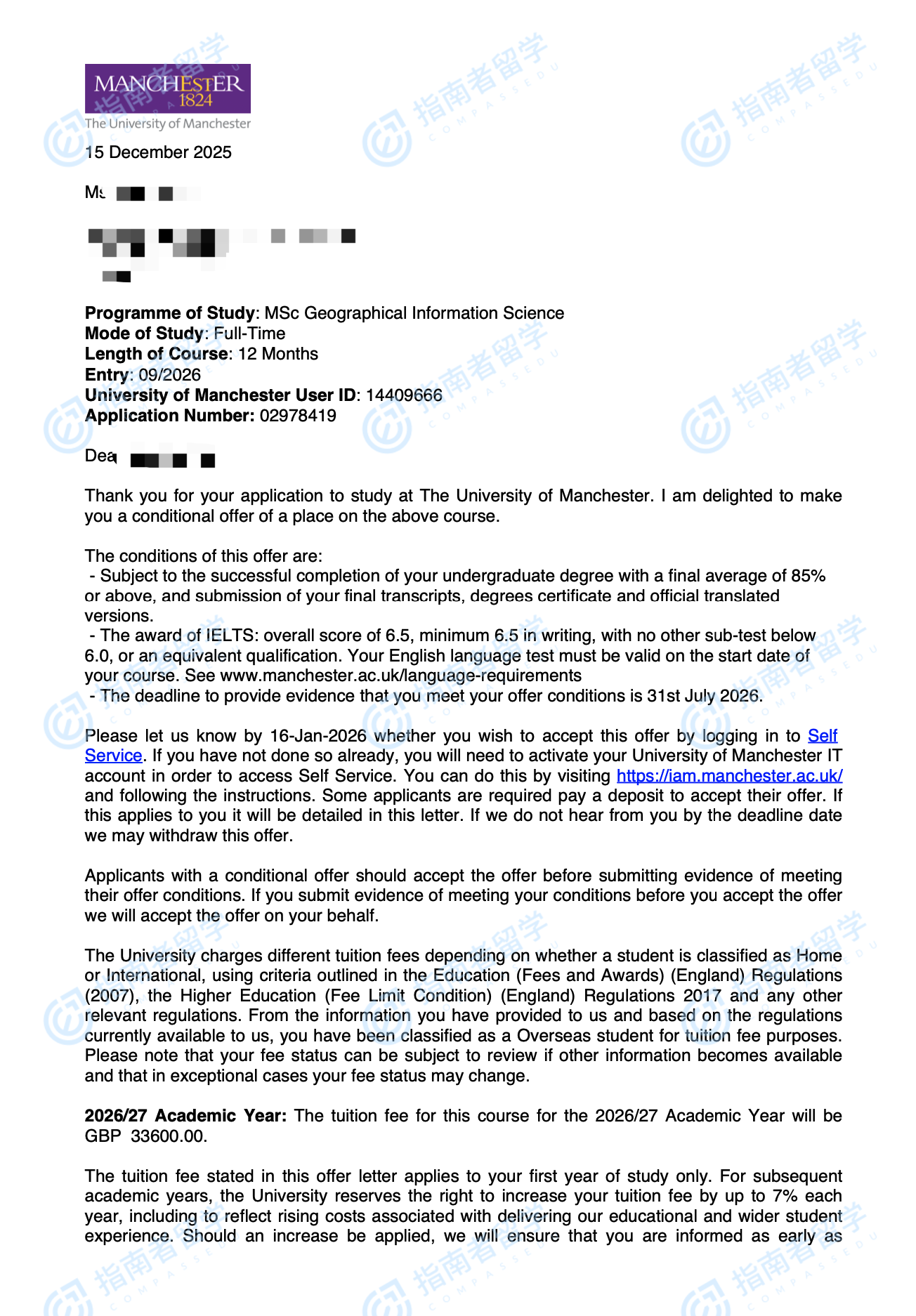 曼徹斯特大學(xué)地理信息科學(xué)理學(xué)碩士研究生offer一枚