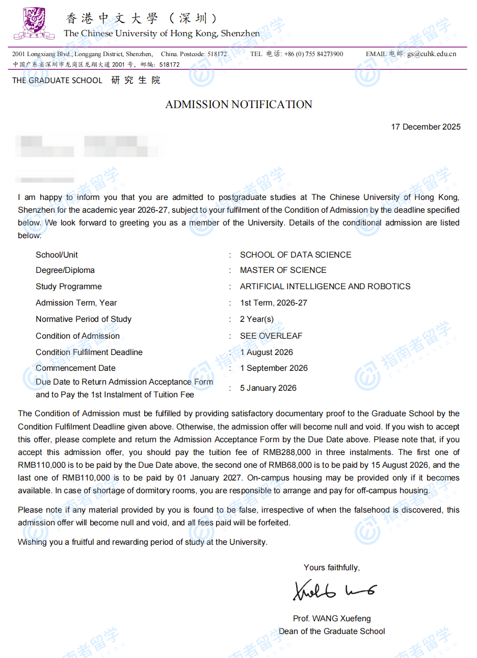 香港中文大學(xué)人工智能與機(jī)器人理學(xué)碩士(CUHK-Shenzhen)研究生offer一枚