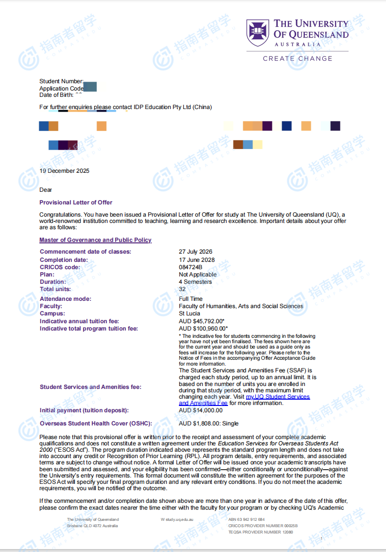 昆士蘭大學(xué)治理與公共政策碩士(1.5年制)研究生offer一枚