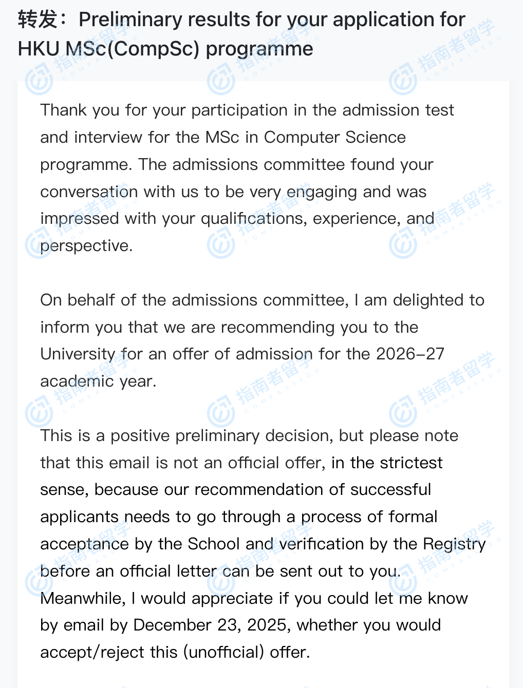 香港大學(xué)計(jì)算機(jī)科學(xué)理學(xué)碩士(常規(guī)方向)研究生offer一枚