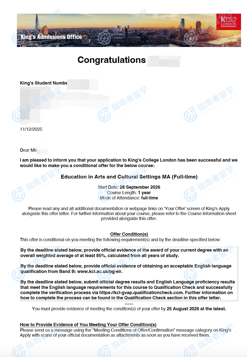 倫敦大學(xué)國王學(xué)院文化與創(chuàng)意產(chǎn)業(yè)文學(xué)碩士研究生offer一枚