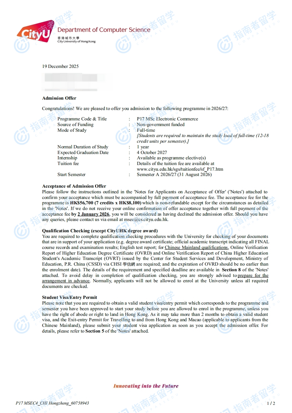 香港城市大學(xué)電子商貿(mào)理學(xué)碩士研究生offer一枚
