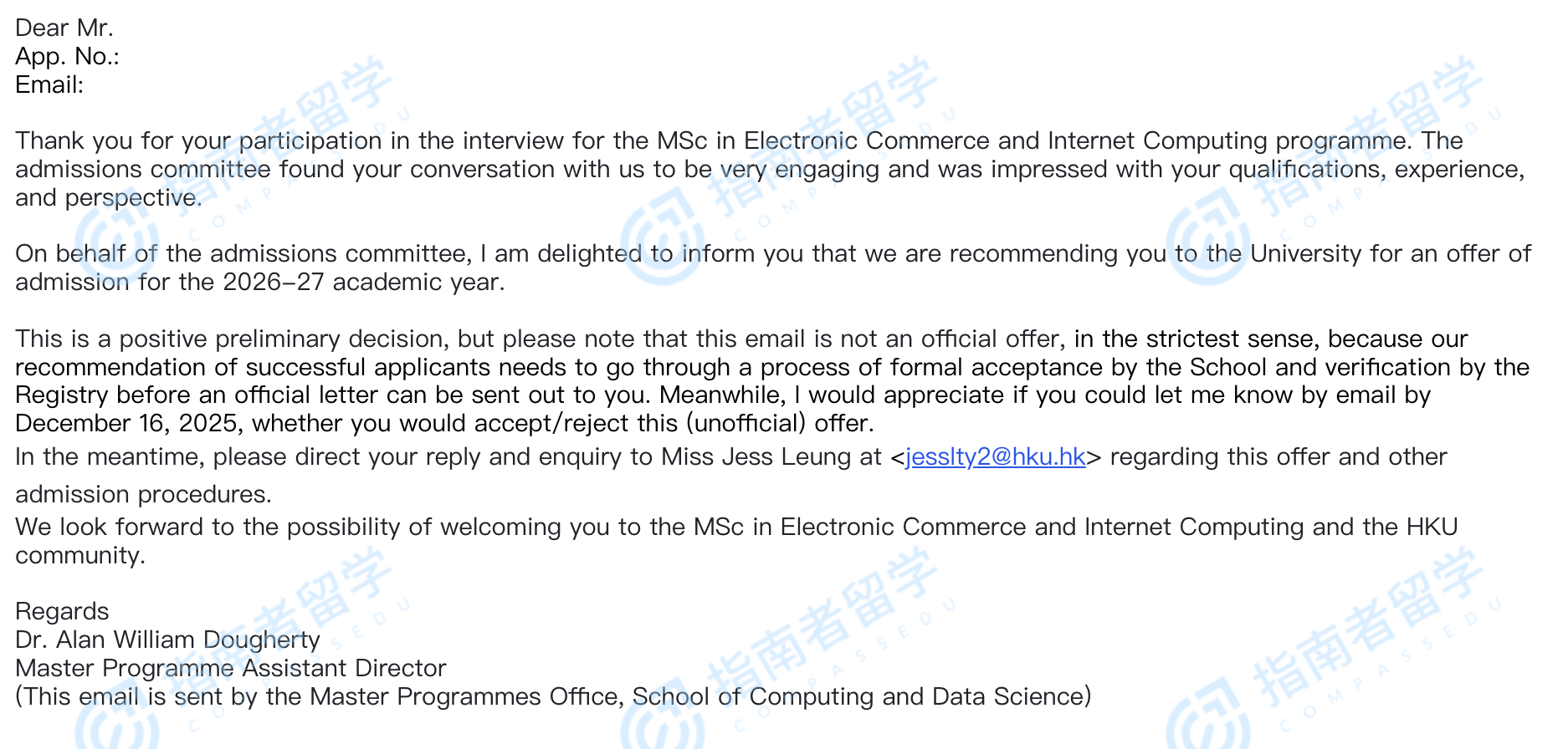 香港大學(xué)電子商貿(mào)及互聯(lián)網(wǎng)工程理學(xué)碩士研究生offer一枚