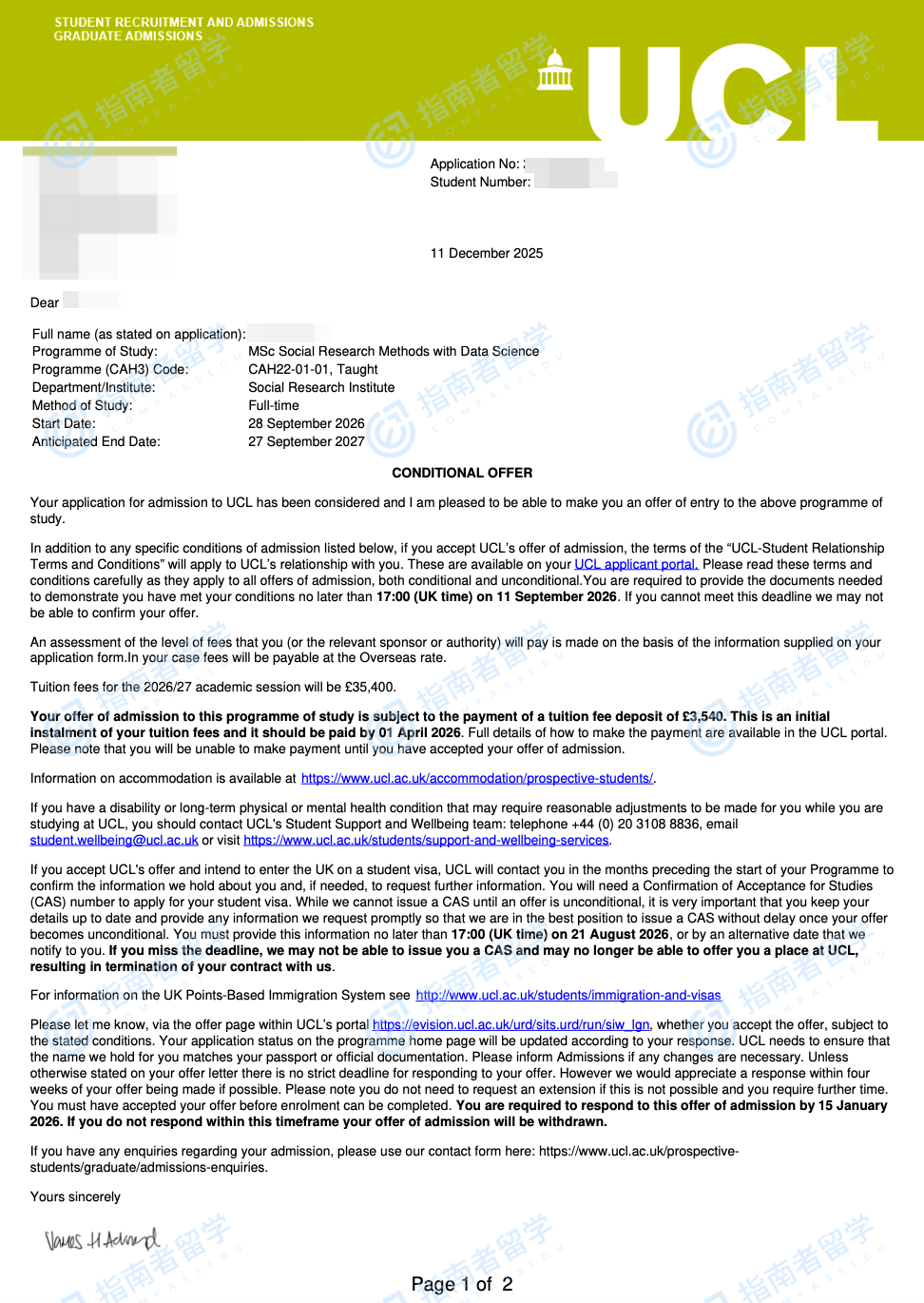 倫敦大學(xué)學(xué)院社會研究方法與數(shù)據(jù)科學(xué)理學(xué)碩士研究生offer一枚