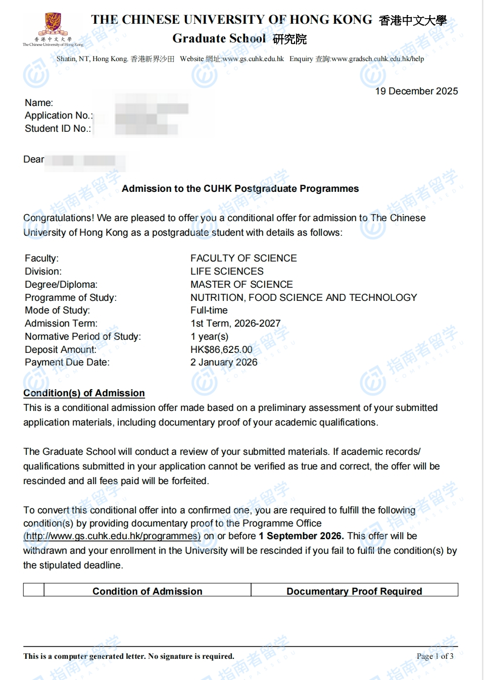 香港中文大學營養(yǎng)與食品科學技術(shù)理學碩士研究生offer一枚