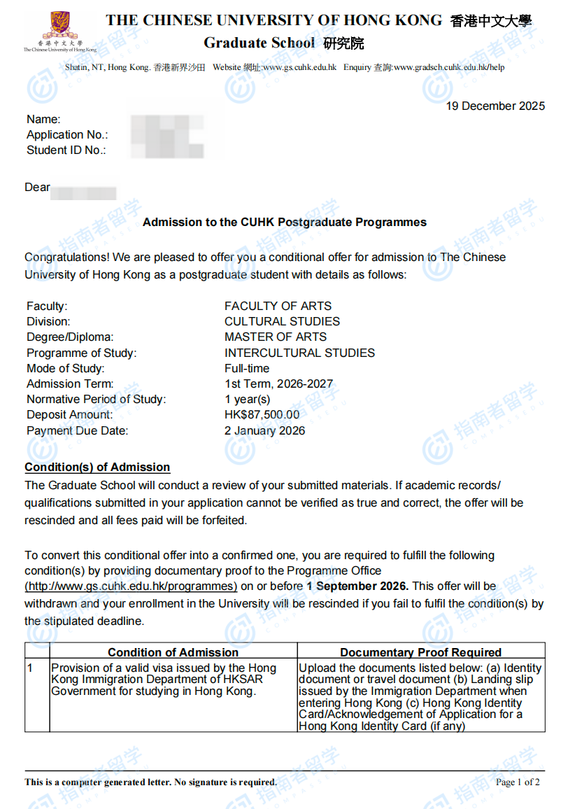 香港中文大學(xué)跨文化研究文學(xué)碩士研究生offer一枚