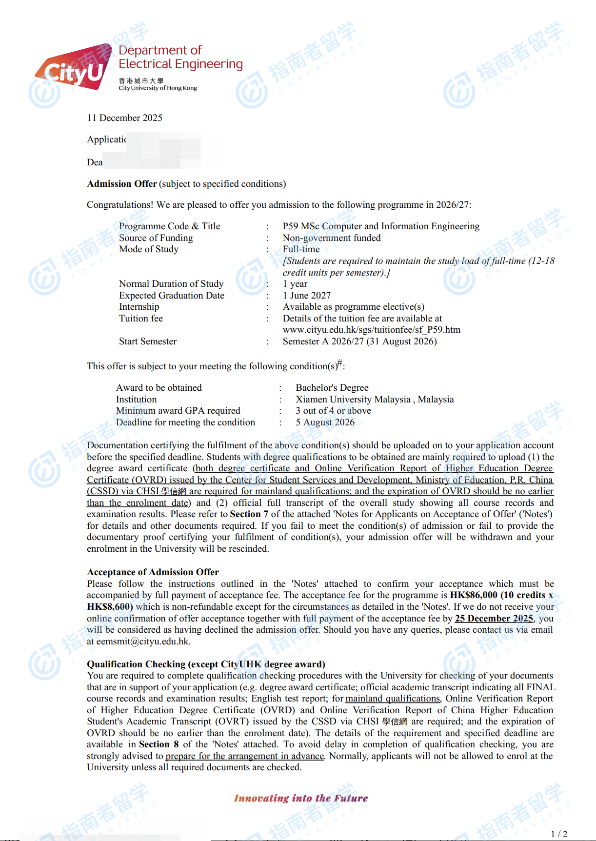 香港城市大學(xué)電子計算機(jī)與資訊工程理學(xué)碩士研究生offer一枚