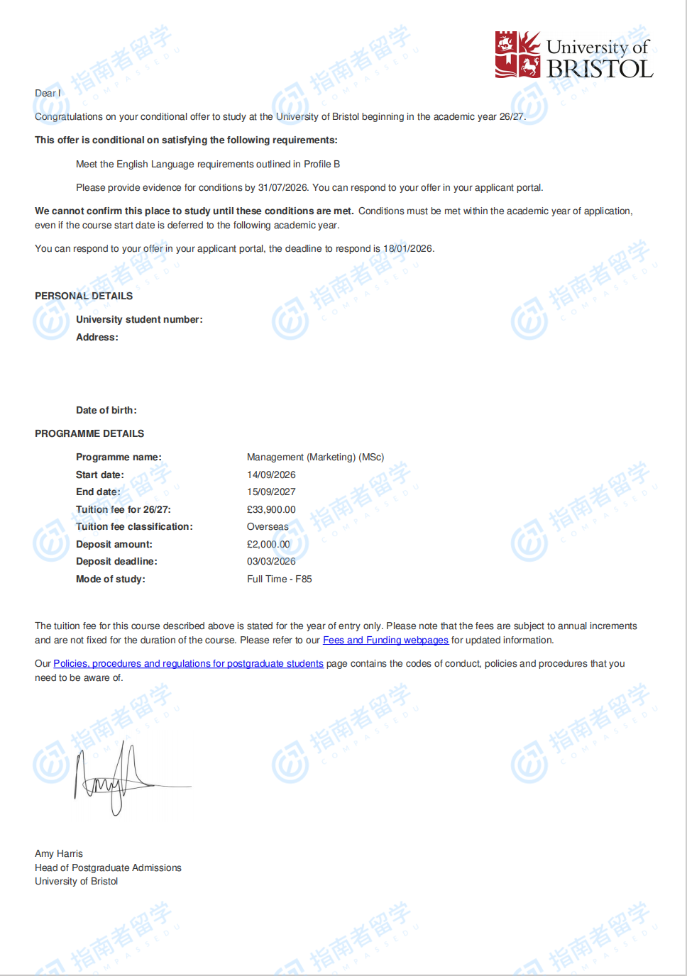 布里斯托大學(xué)管理學(xué)理學(xué)碩士(市場營銷 )研究生offer一枚