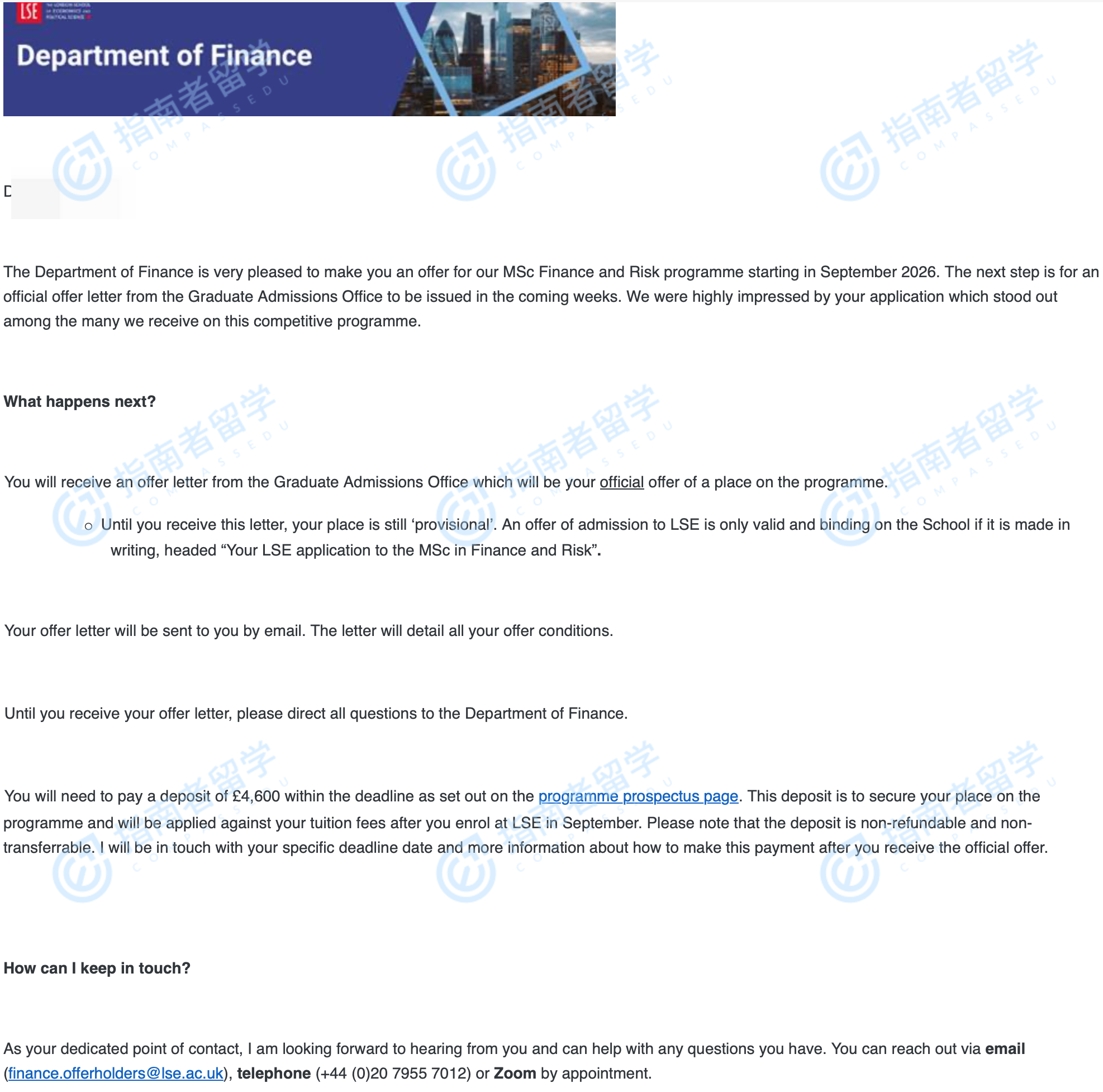 倫敦政治經(jīng)濟學院金融與風險理學碩士研究生offer一枚