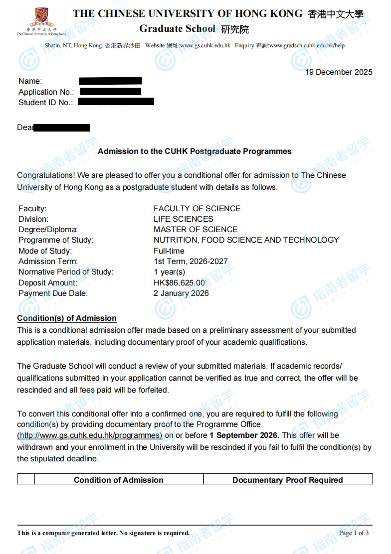 香港中文大學(xué)營(yíng)養(yǎng)與食品科學(xué)技術(shù)理學(xué)碩士研究生offer一枚