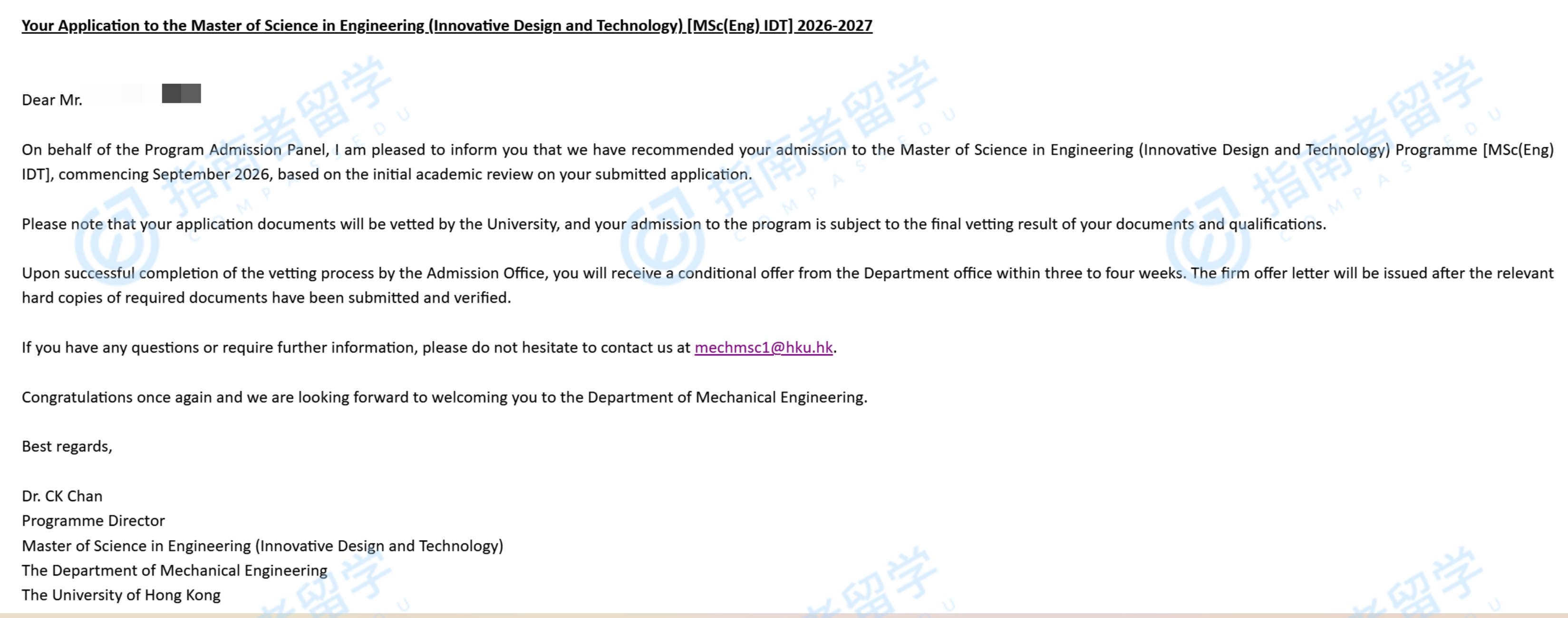 香港大學(xué)創(chuàng)新設(shè)計(jì)與科技(工程)理學(xué)碩士研究生offer一枚