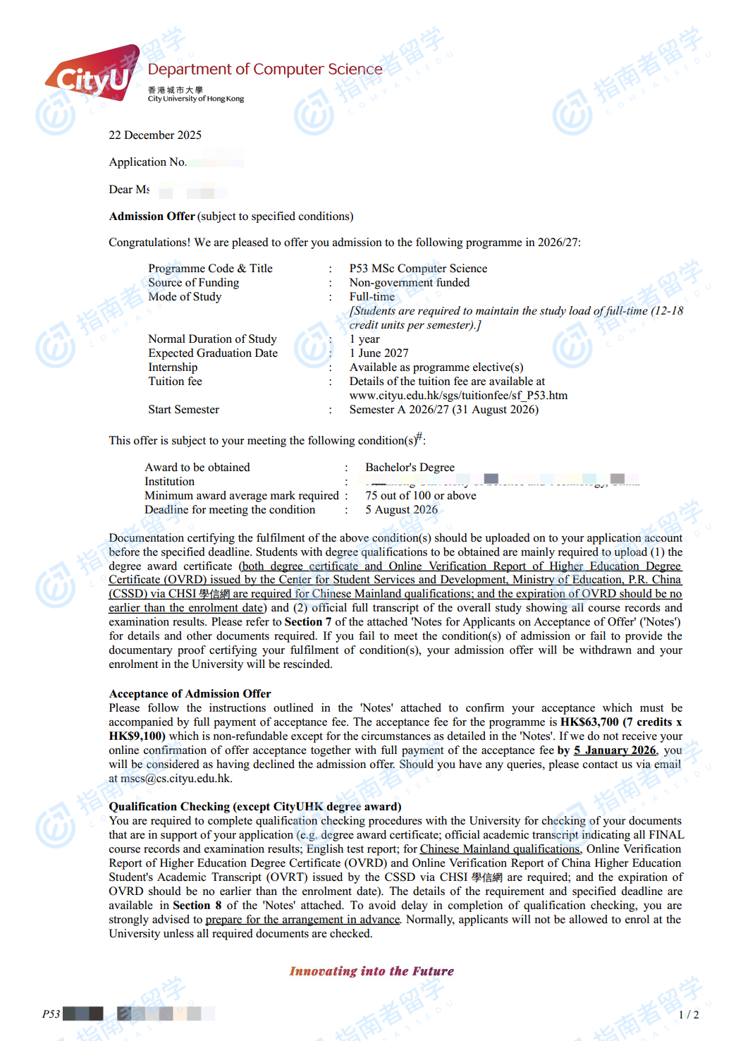 香港城市大學計算機科學理學碩士研究生offer一枚