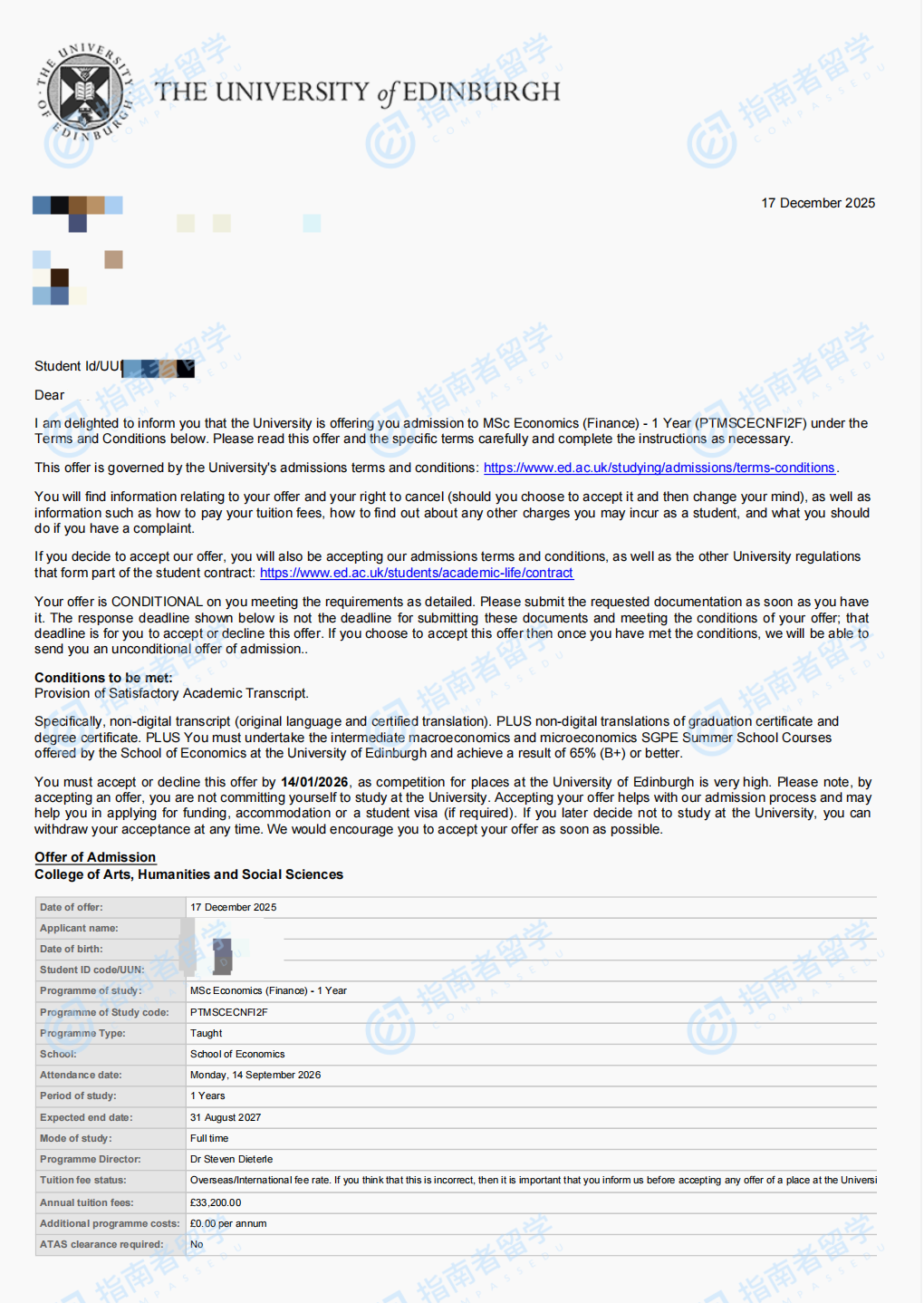 愛丁堡大學(xué)經(jīng)濟(jì)學(xué)(金融)理學(xué)碩士研究生offer一枚