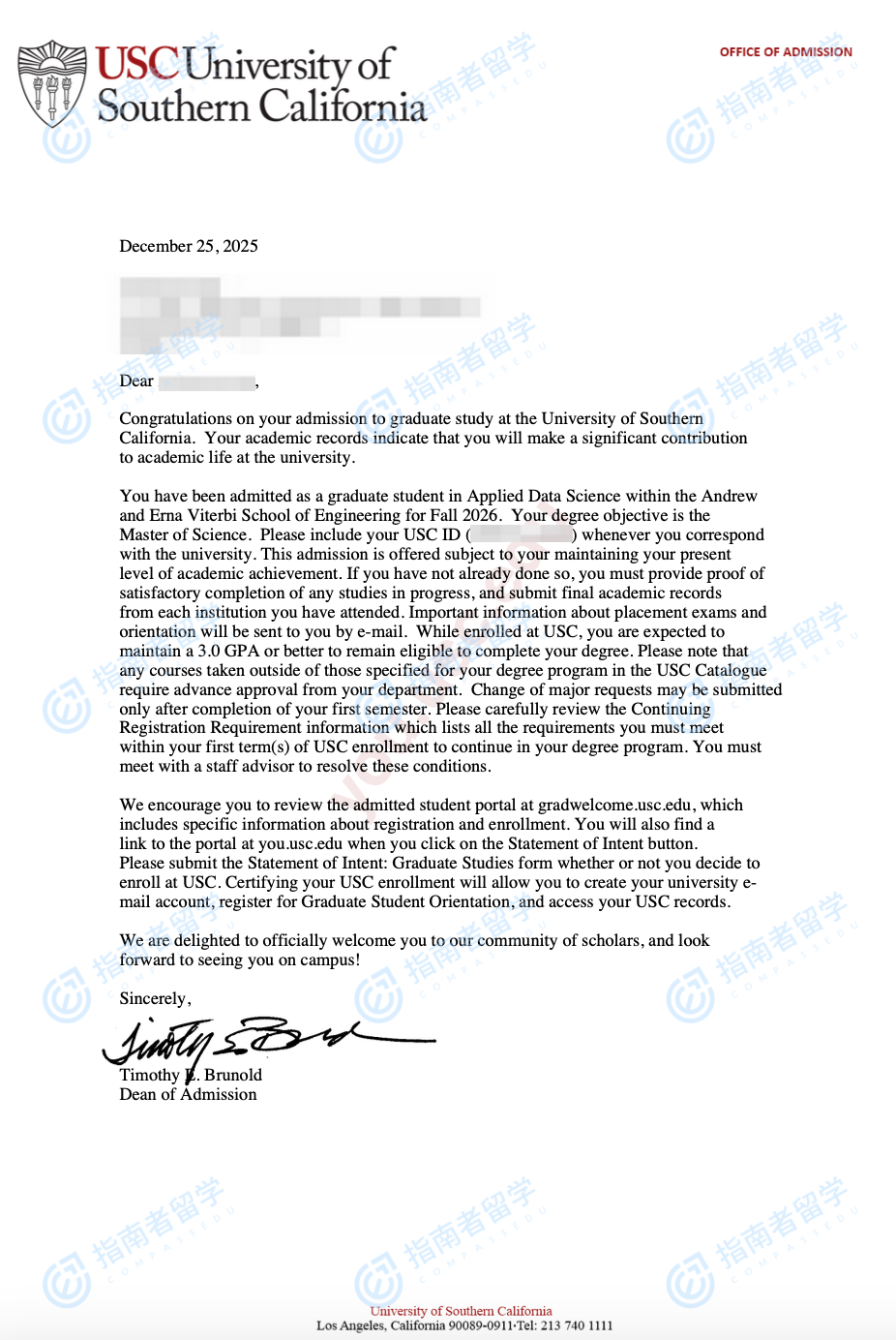 南加州大學運籌學工程理學碩士研究生offer一枚